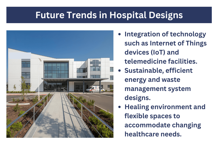 - Hospital architectural design services. Our skilled architects design MoH-compliant building structures with patients in mind. We prioritise natural lighting, calming colours, clear wayfinding, private rooms, comfortable spaces for family members, and biophilic designs to ensure the well-being of patients, visitors, and medical practitioners.
