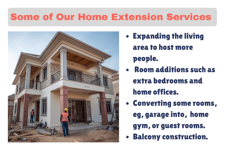 - Our company’s reputation rests on the assurance that all projects have been delivered to meet functional and aesthetic expectations. We carefully design building extensions to increase space and improve the overall look and style of the property. Maintaining high building extension standards makes our services remain the most reliable in Kenya.